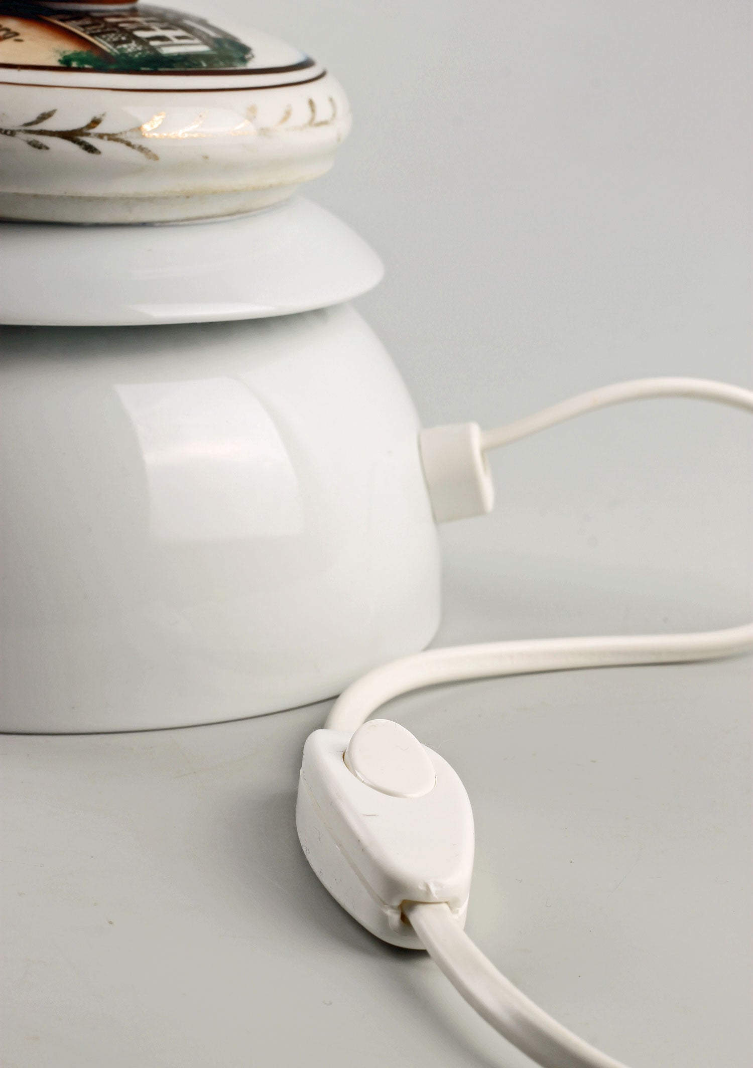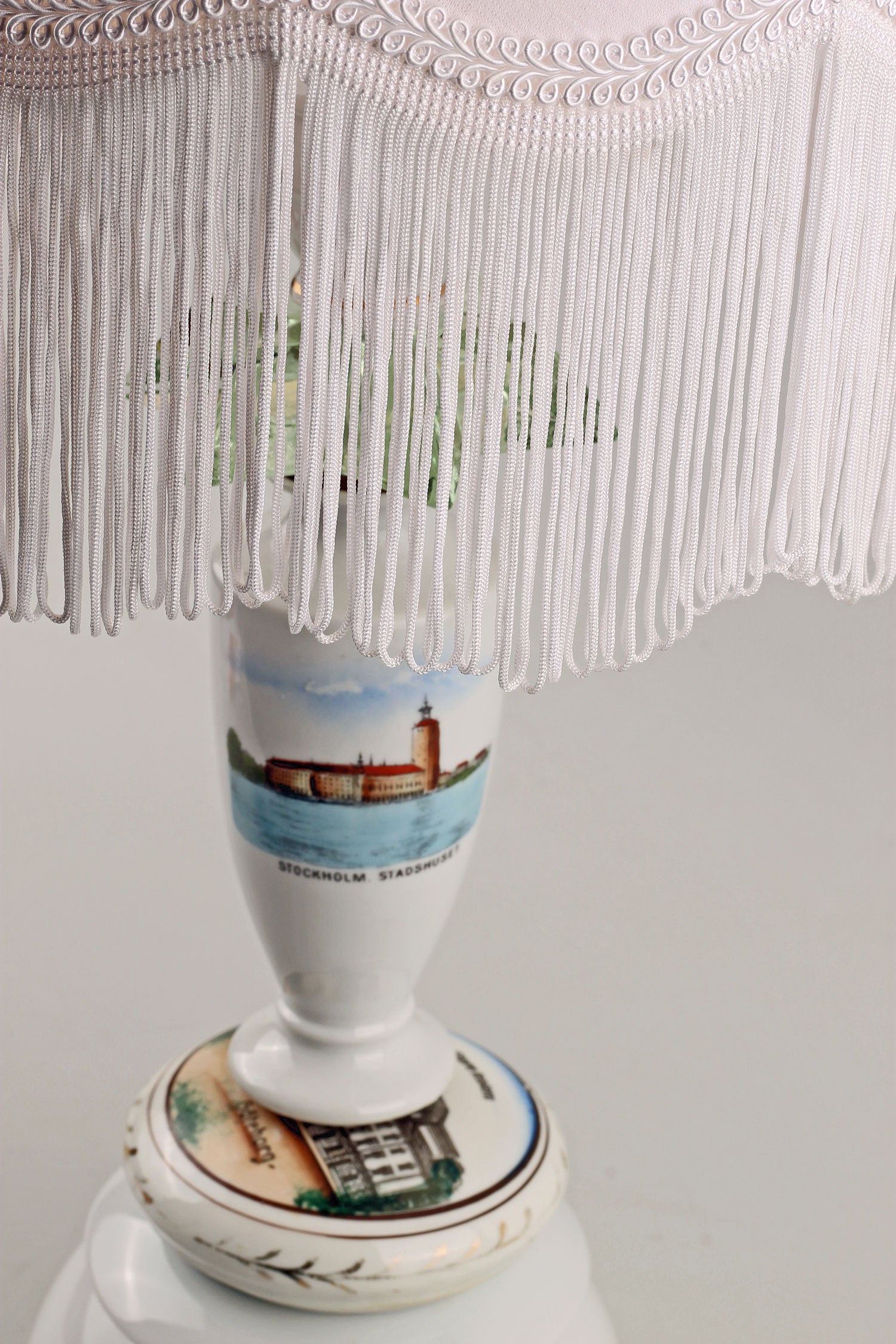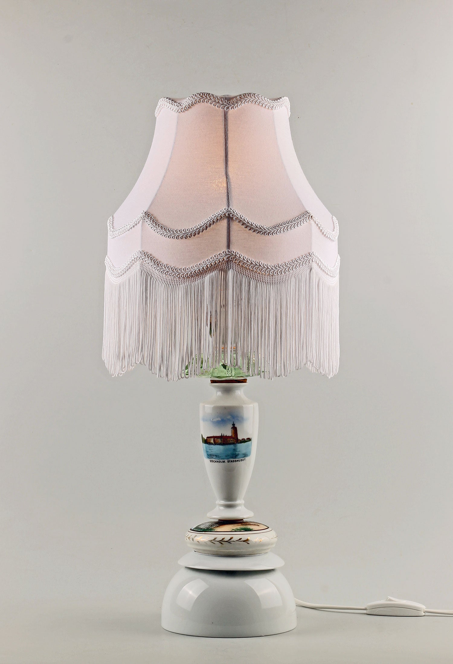Nytillverkad vit lampskärm med fransar och klofäste medföljer. Skärmhöjd: 20 cm. Skärmdiametrar: 14/23 cm.