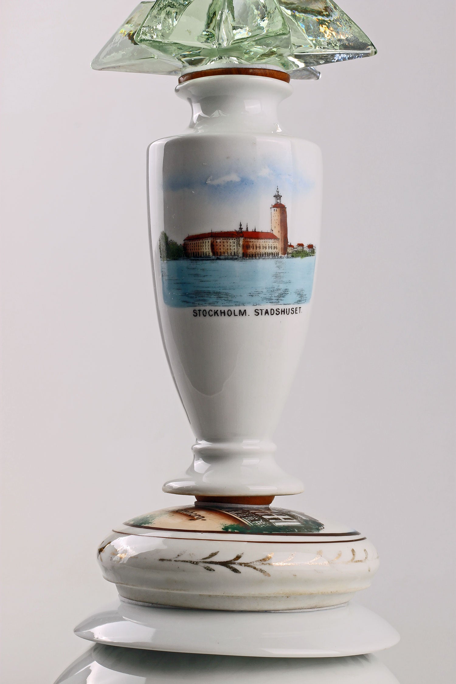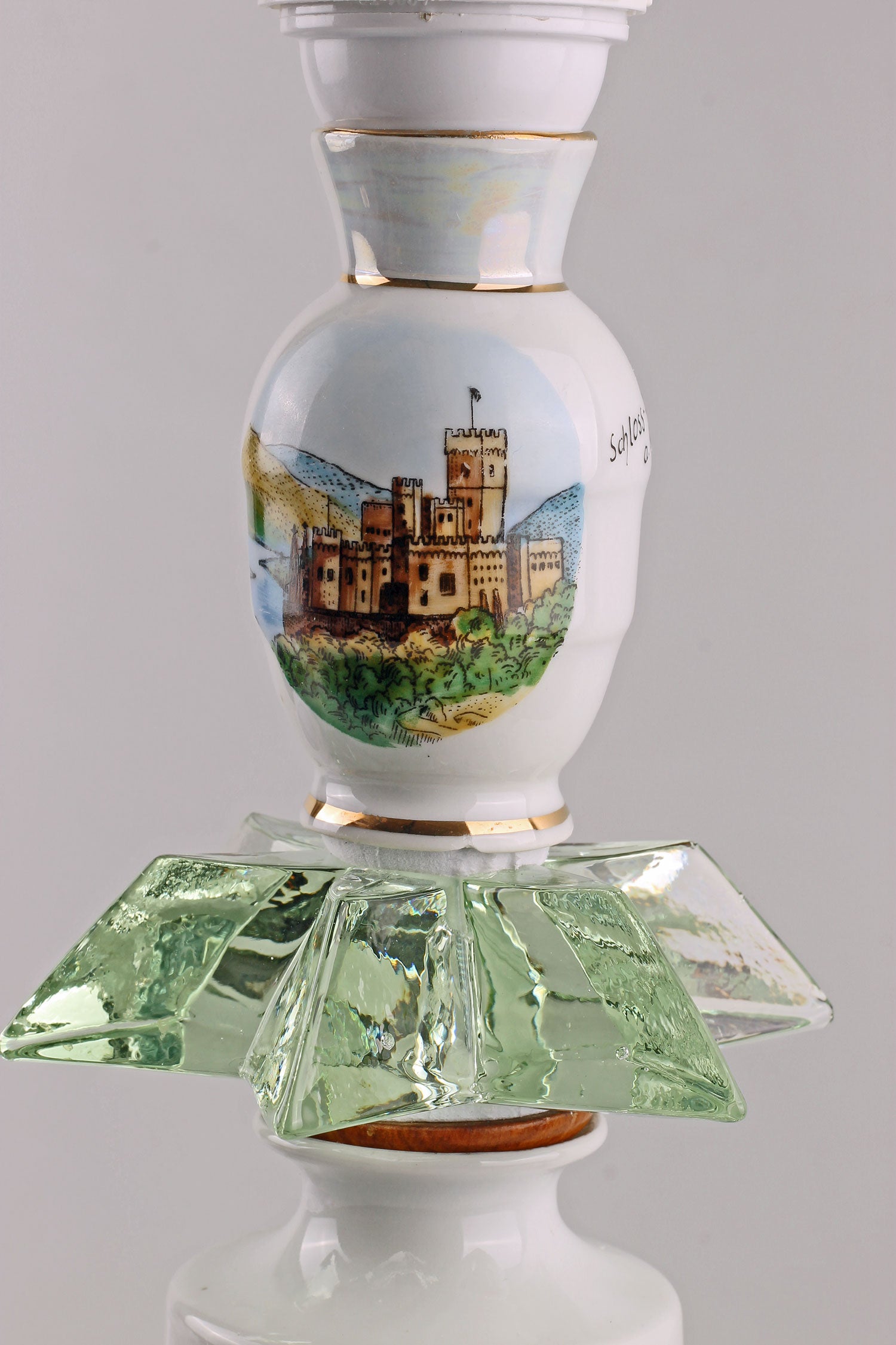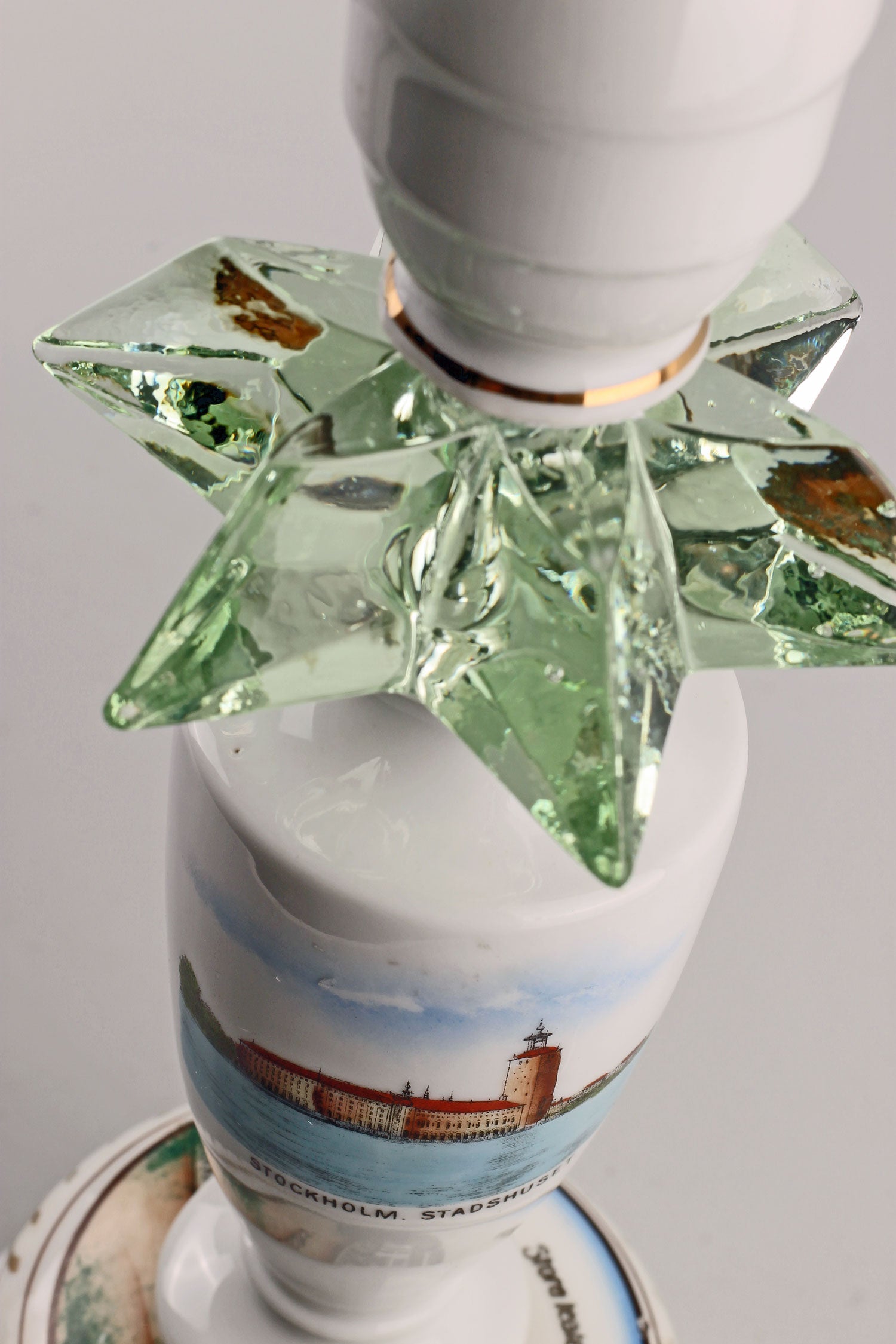 Nytillverkad vit lampskärm med fransar och klofäste medföljer. Skärmhöjd: 20 cm. Skärmdiametrar: 14/23 cm.