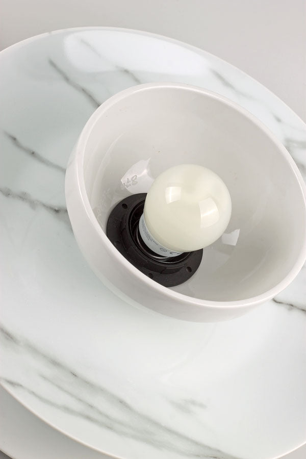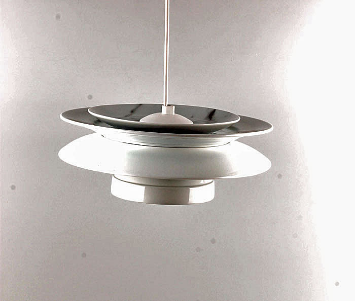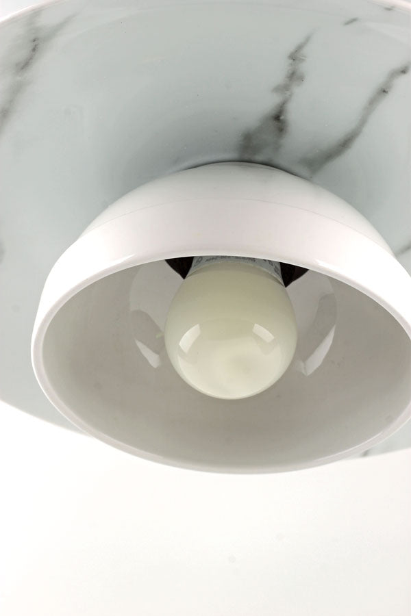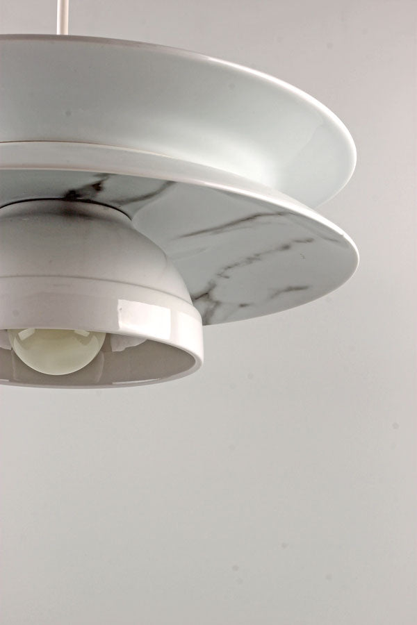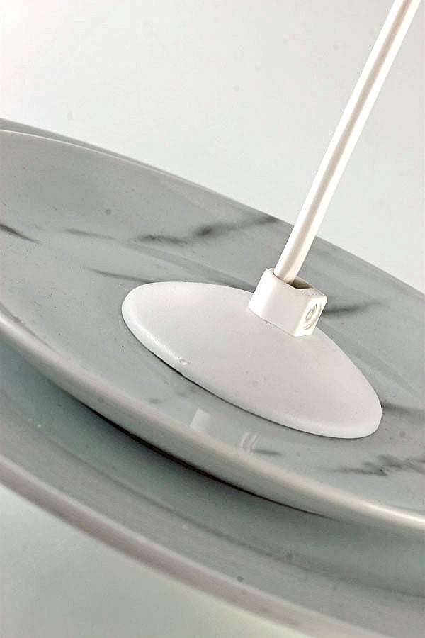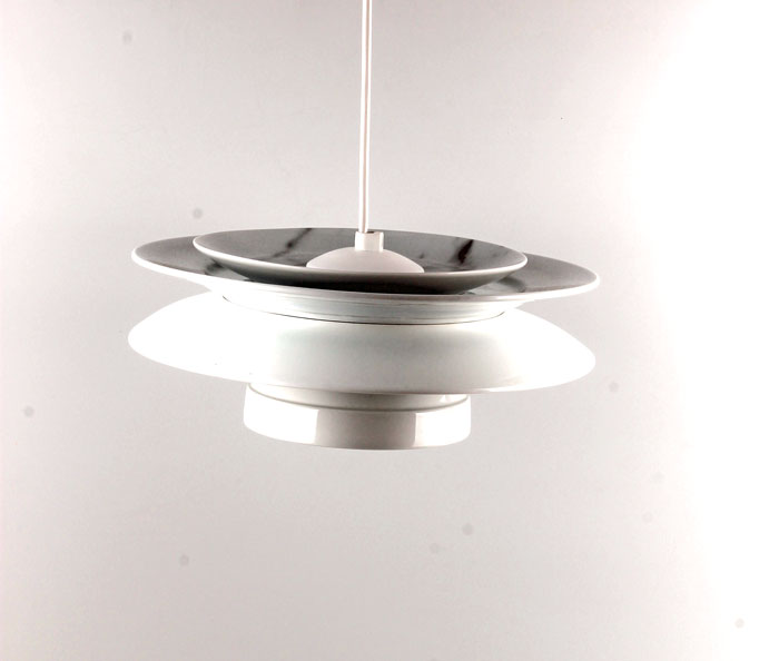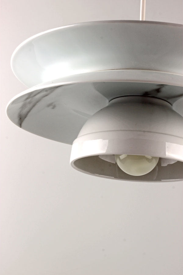Marmormönstrade tallrikar i kombination med vita skålar ger en unik och sober pendellampa som passar perfekt för det mindre matbordet eller över soffbordet.