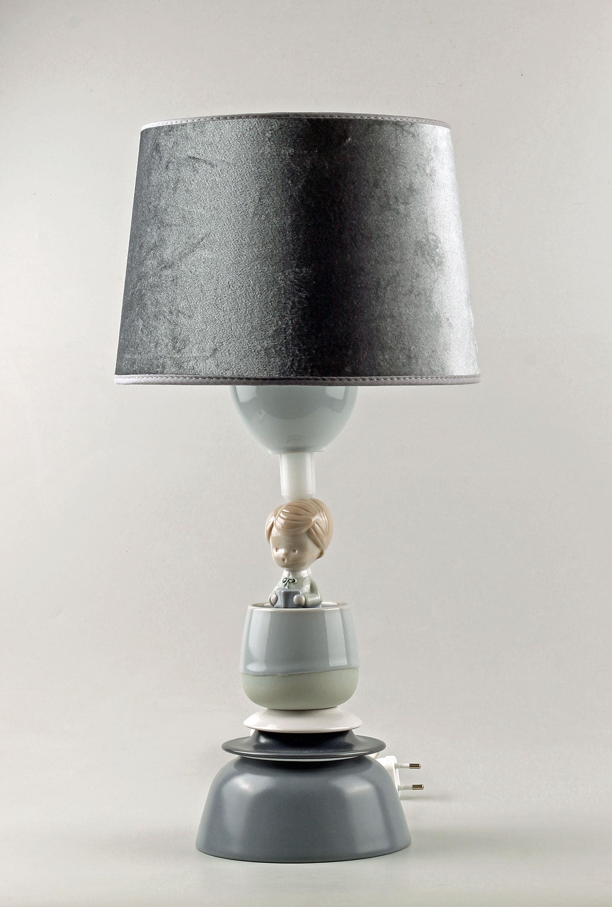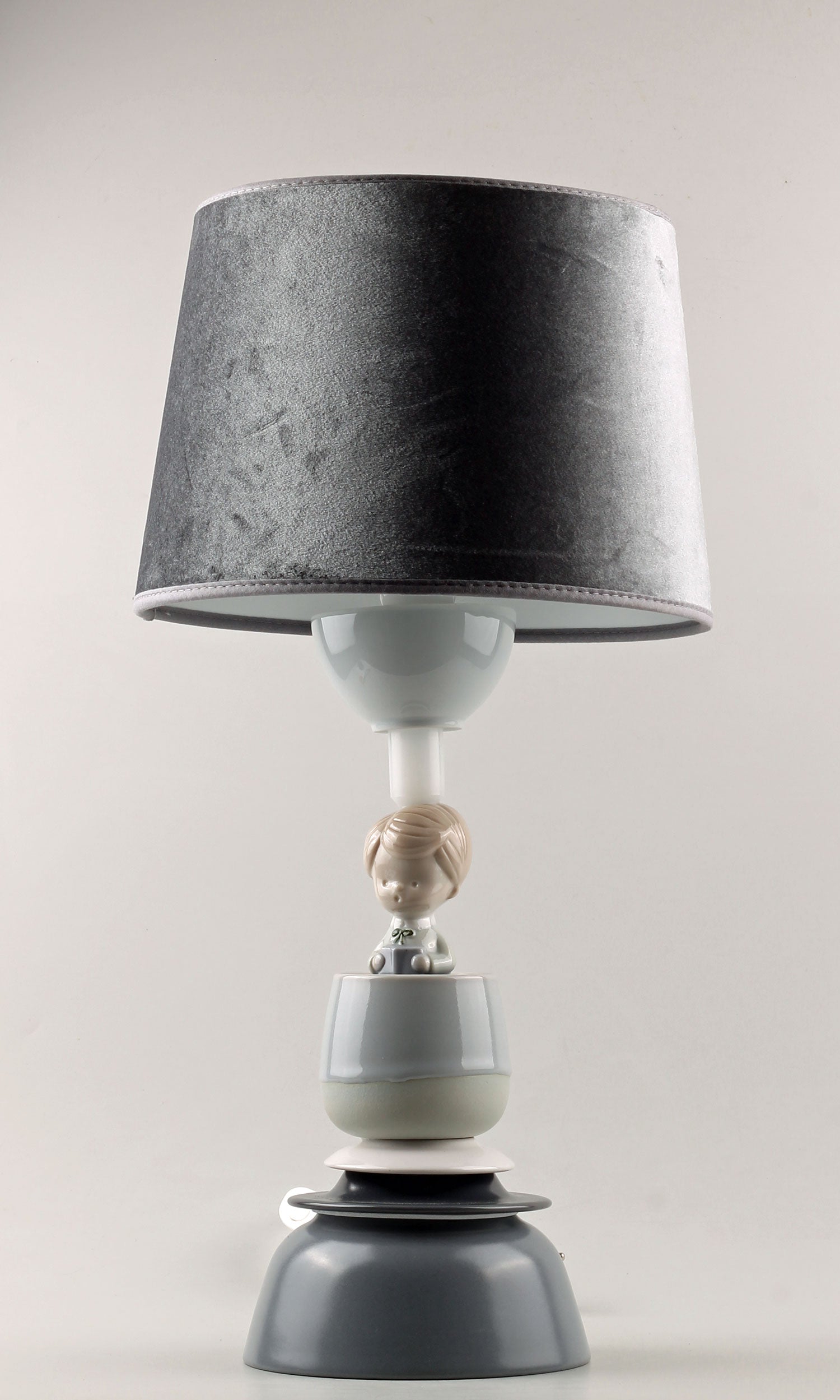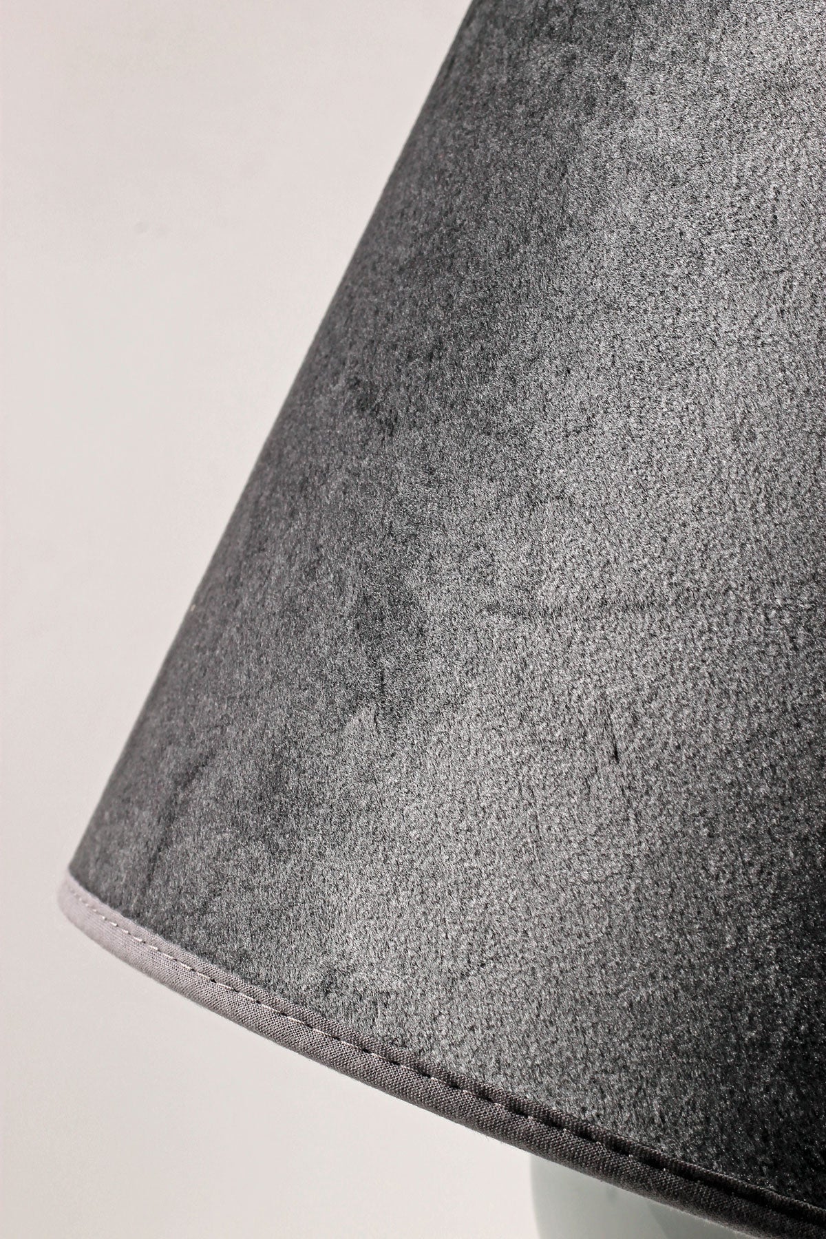 Nytillverkad gråblå sammetslampskärm medföljer. Skärmhöjd: 17 cm. Skärmdiametrar: 20 / 23 cm.