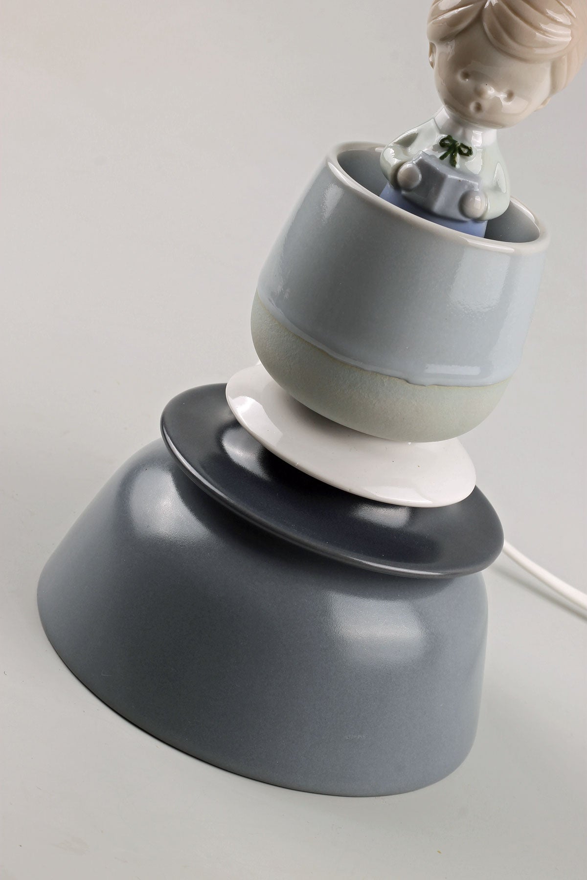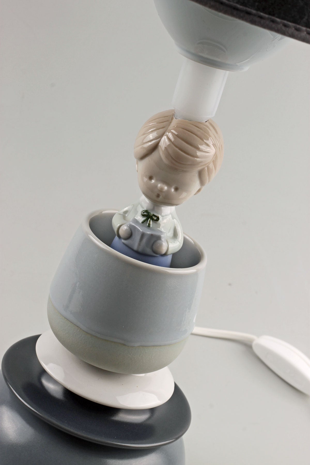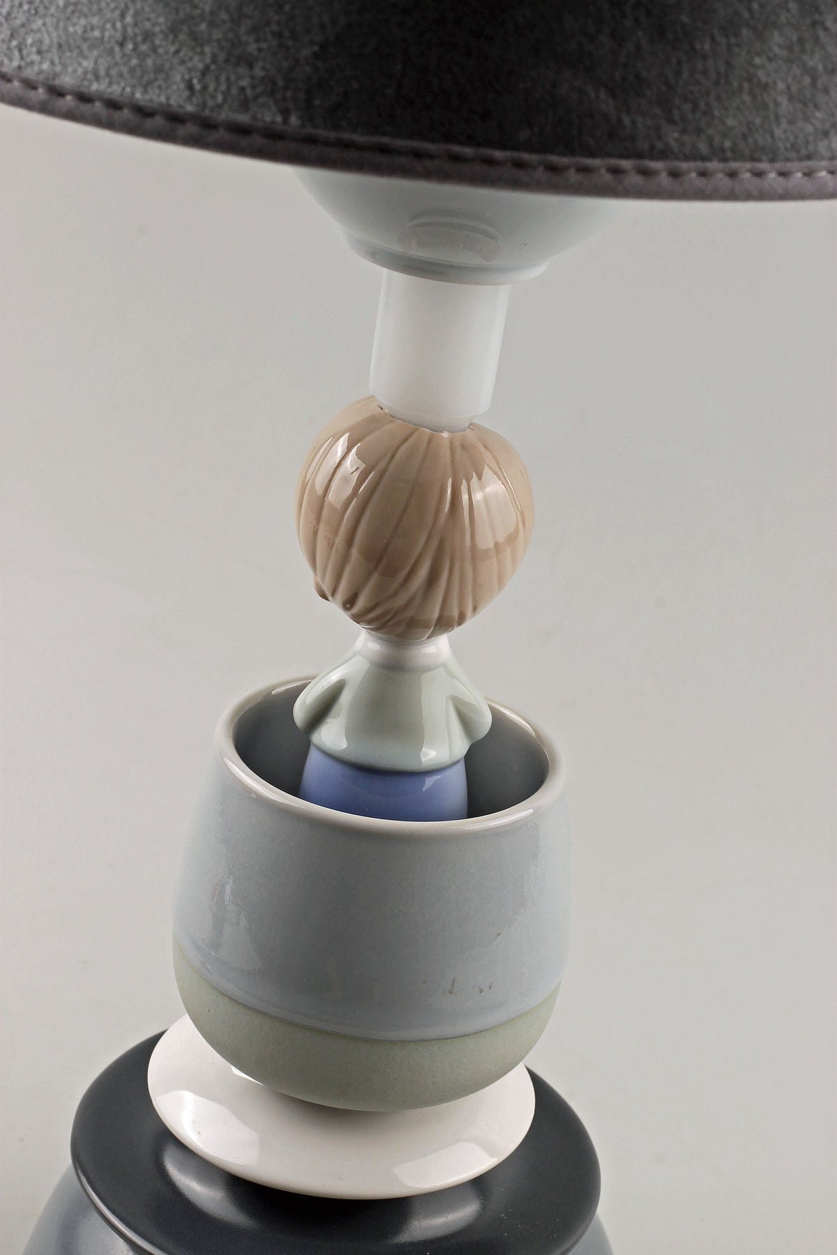 Nytillverkad gråblå sammetslampskärm medföljer. Skärmhöjd: 17 cm. Skärmdiametrar: 20 / 23 cm.
